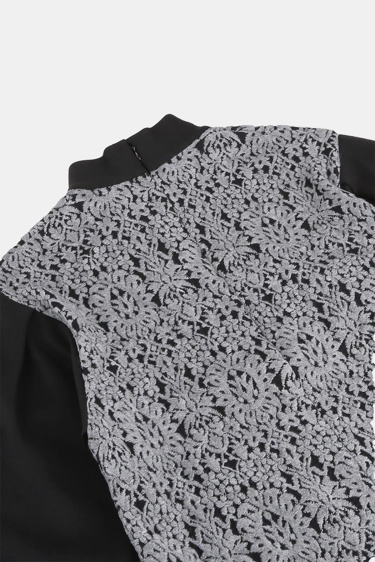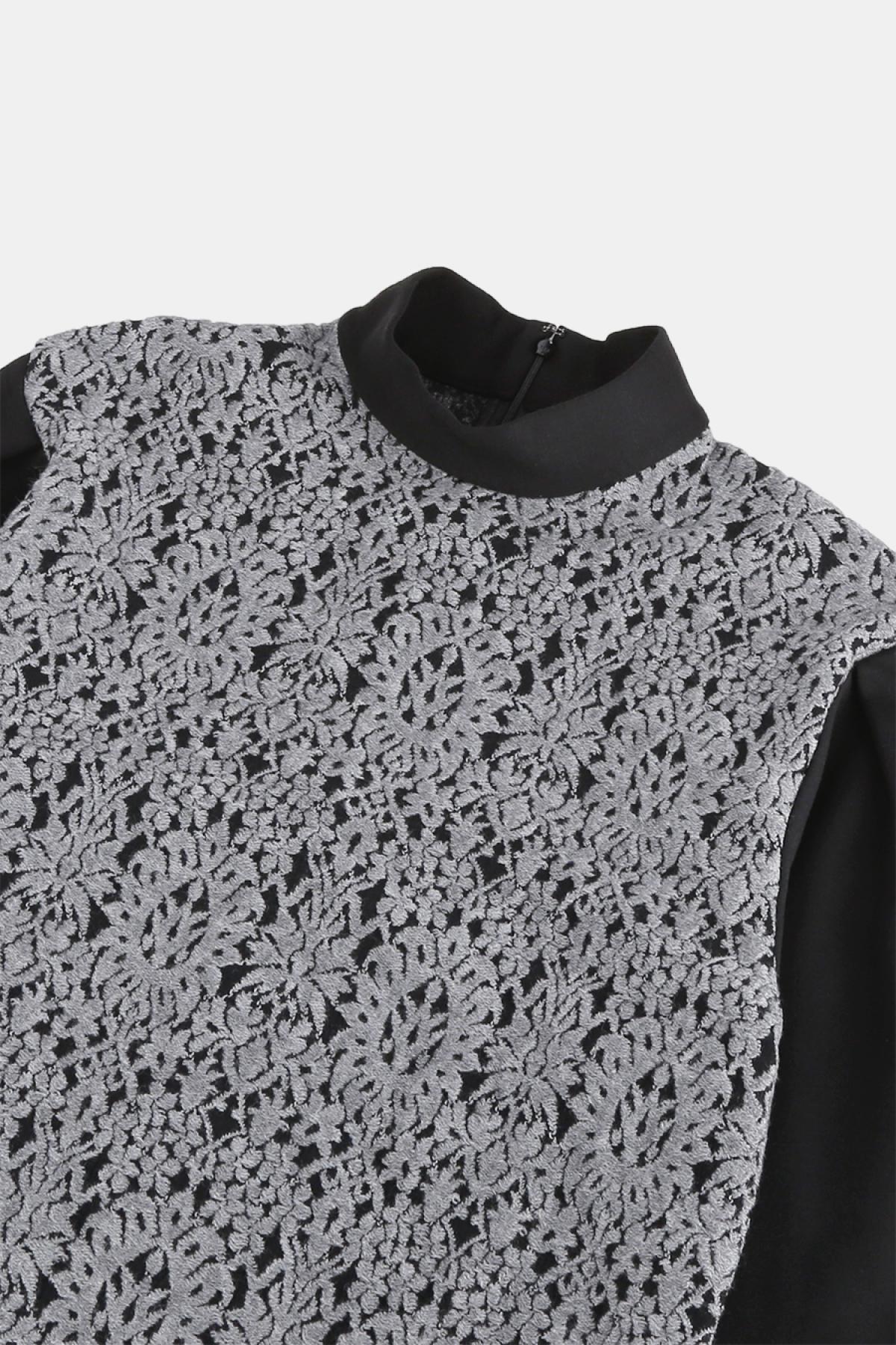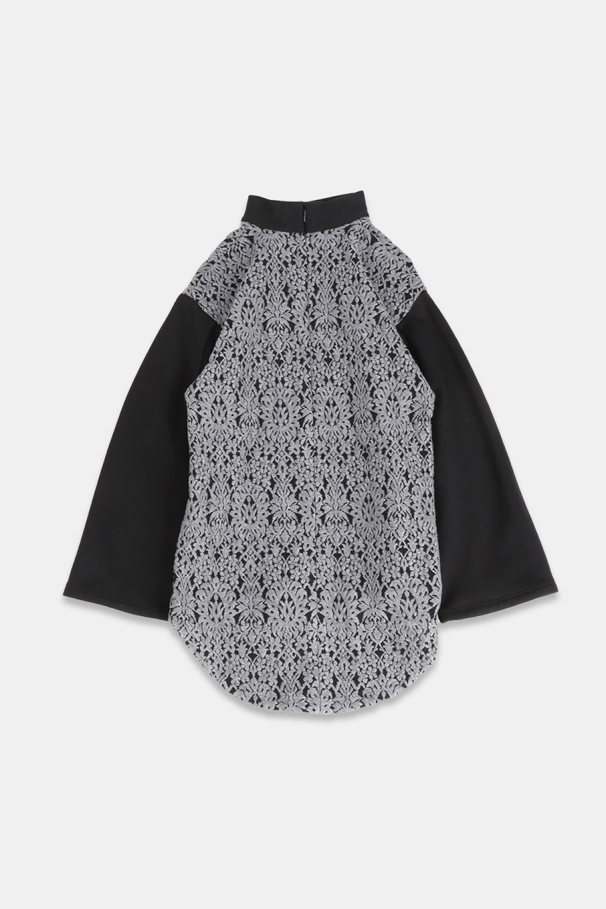 フロントとバックにタペストリー柄のレースを使用し、襟と袖を無地で切り替えたシンプルな中にもファッション性を感じさせるデザインが印象的なハイネックプルオーバー。