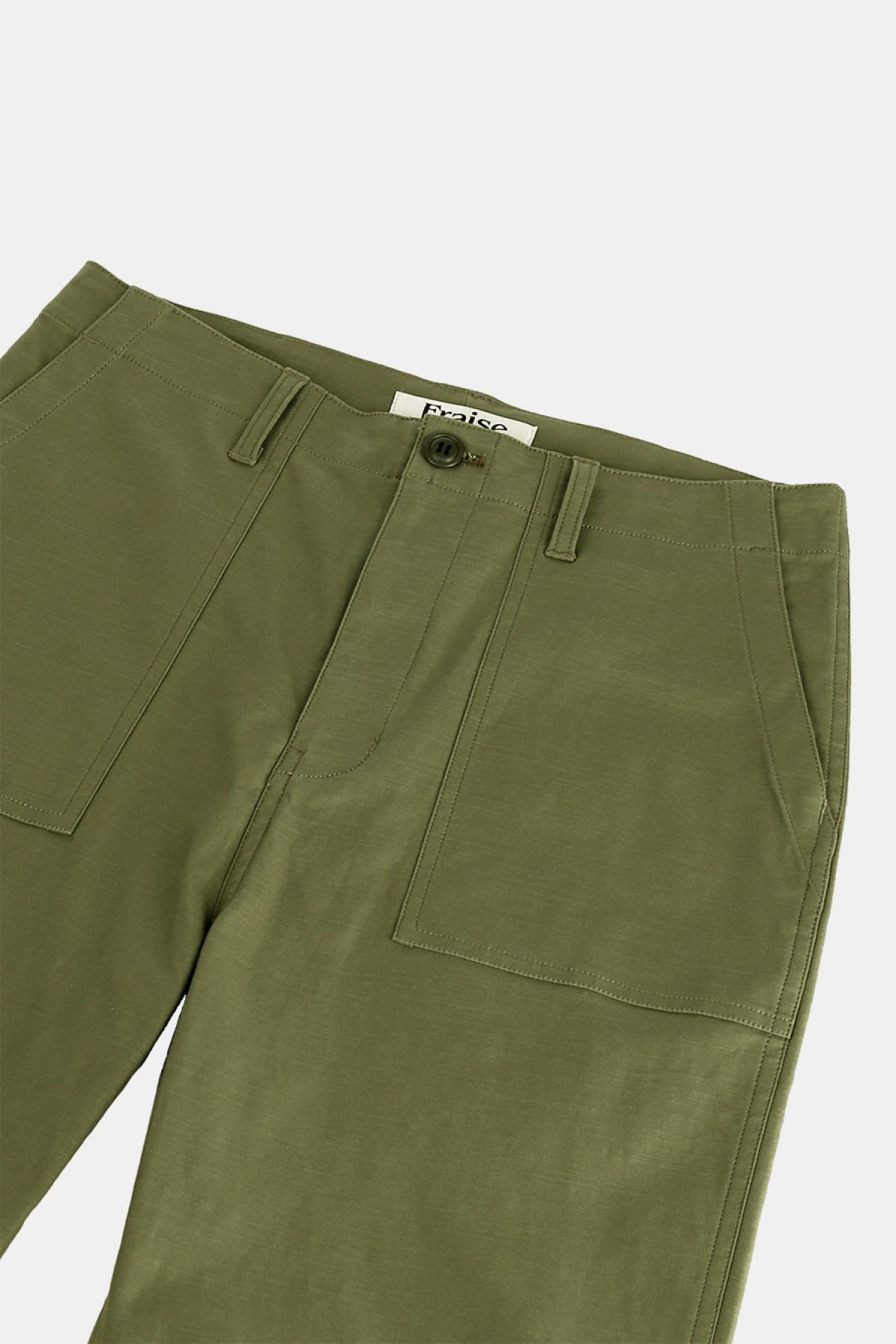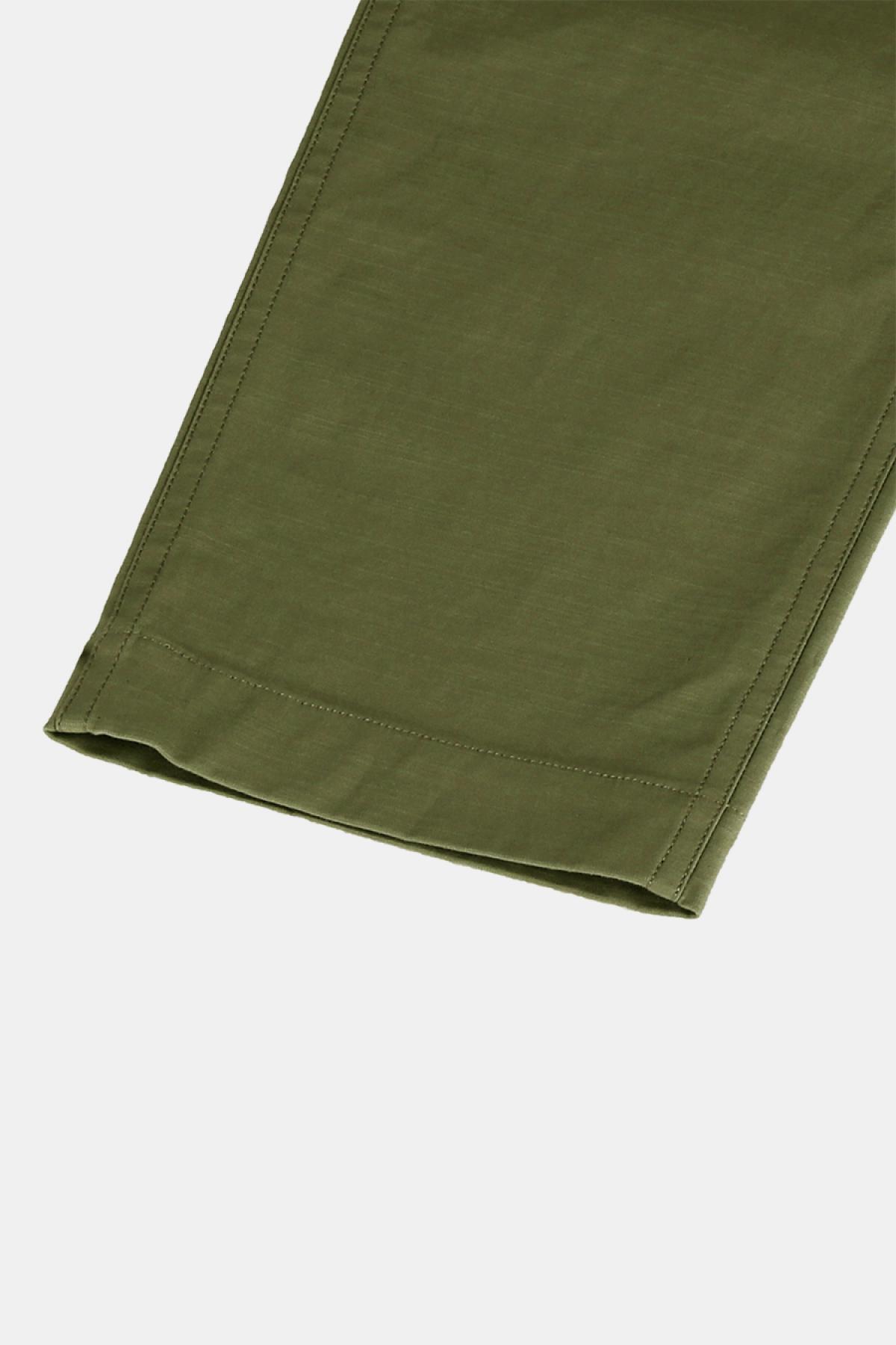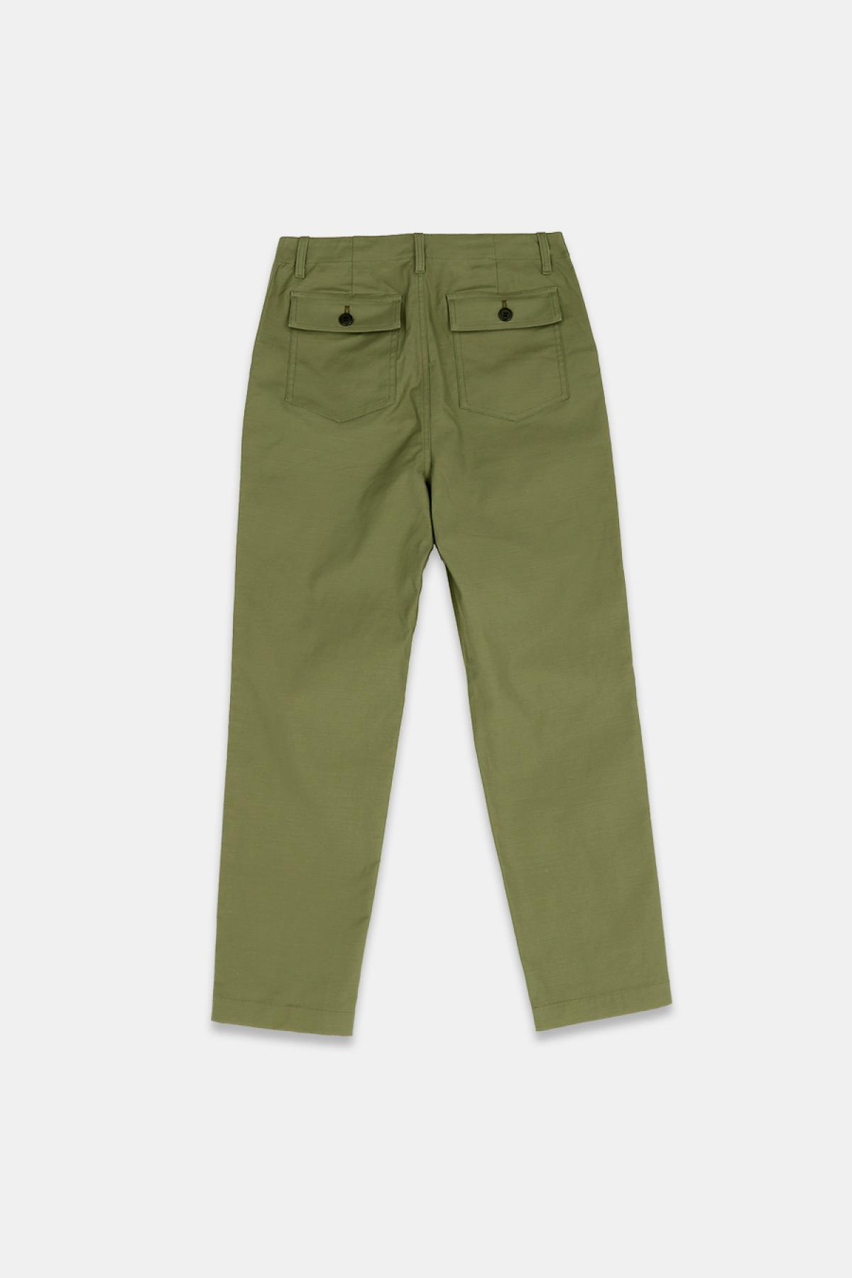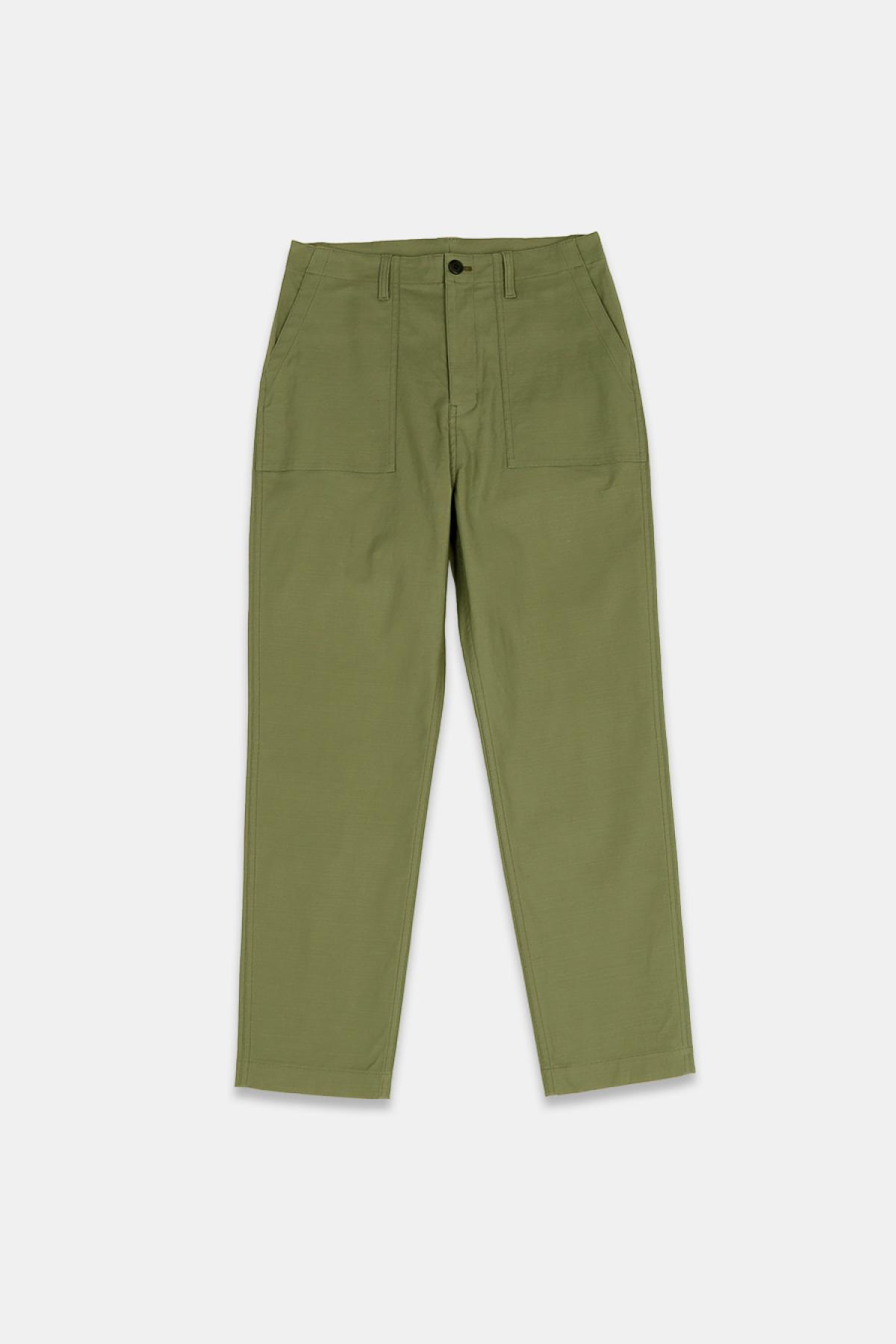 素材には、ややしっかりとした厚みと伸縮性の高さが特徴のアーミーブロークンストレッチを使用、裾に向けて徐々に細くなるテーパードシルエットも、この商品の特徴となります。