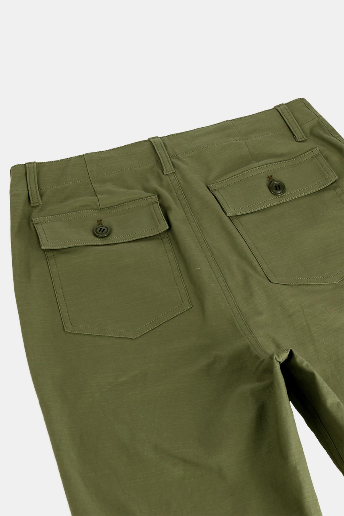 大きくて深めの平面的なフロントポケットとフラップ付きのバックポケットのデザインが印象的なベイカーパンツ。