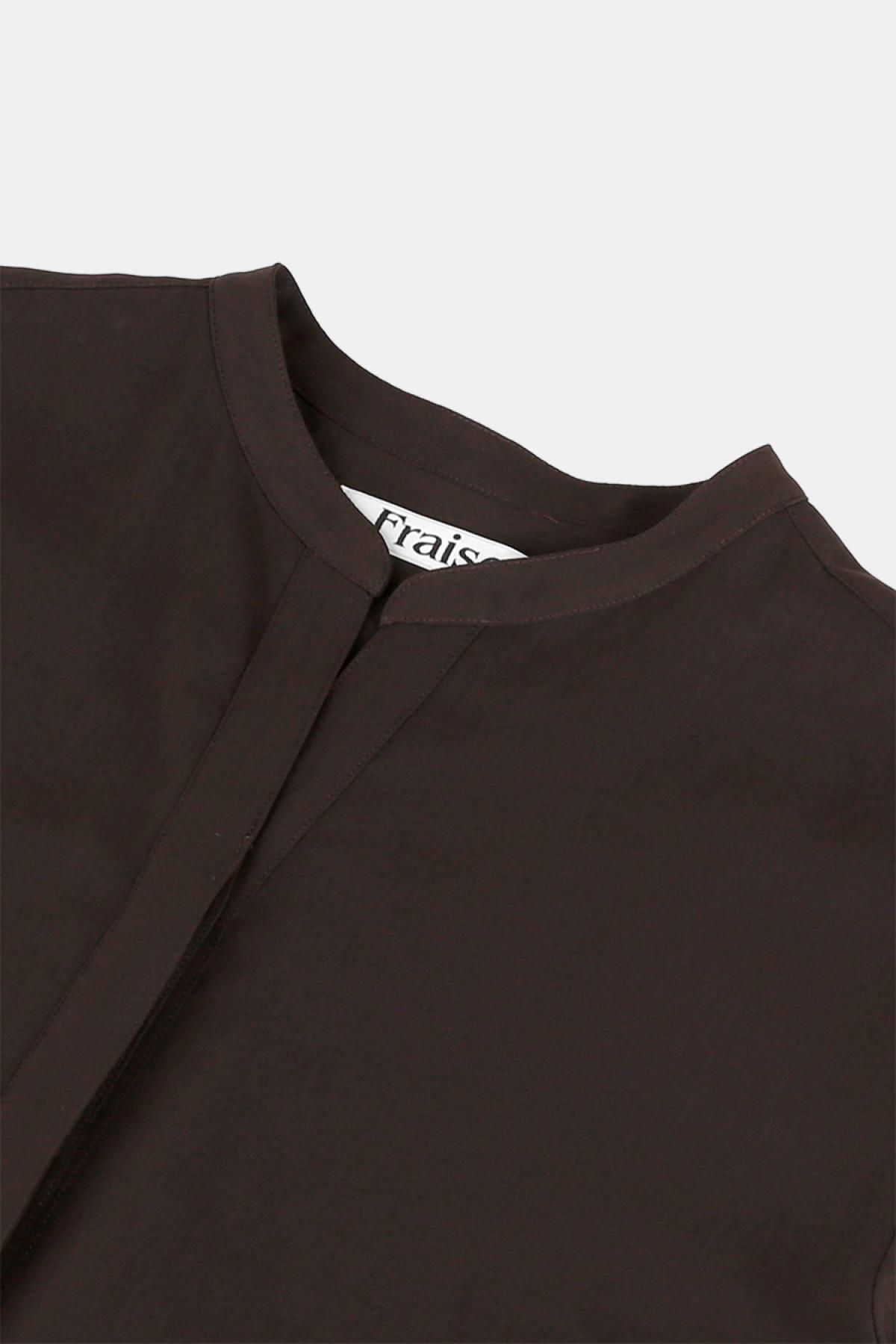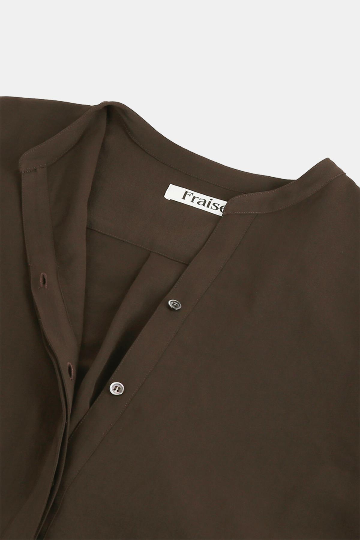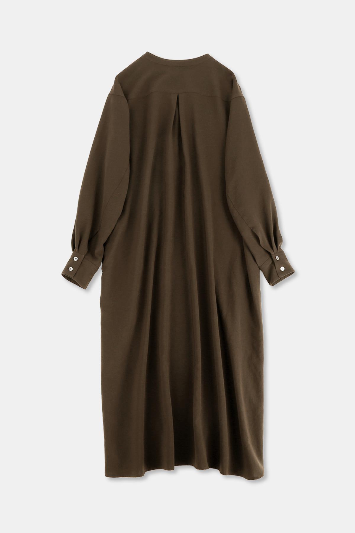 首回りをすっきりとした印象に見せてくれるバンドカラー、ボタンが隠れるように作られた比翼仕上げ、シックで上品なデザインが印象的なシャツワンピース。