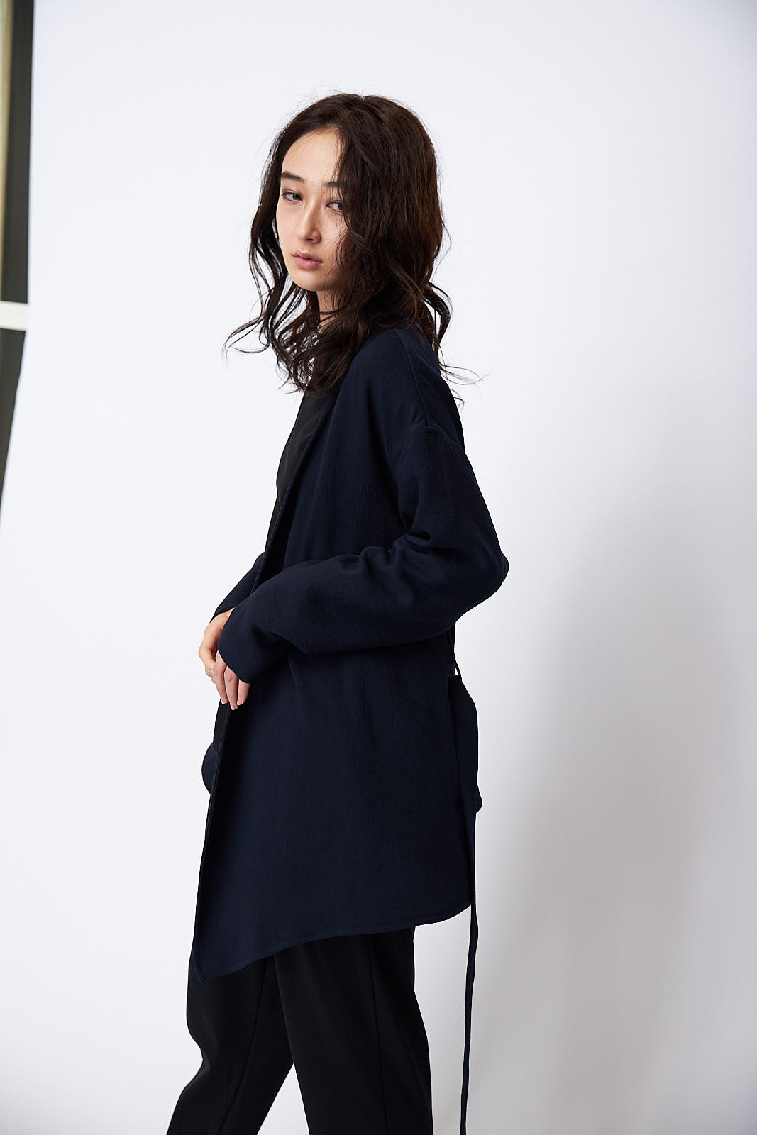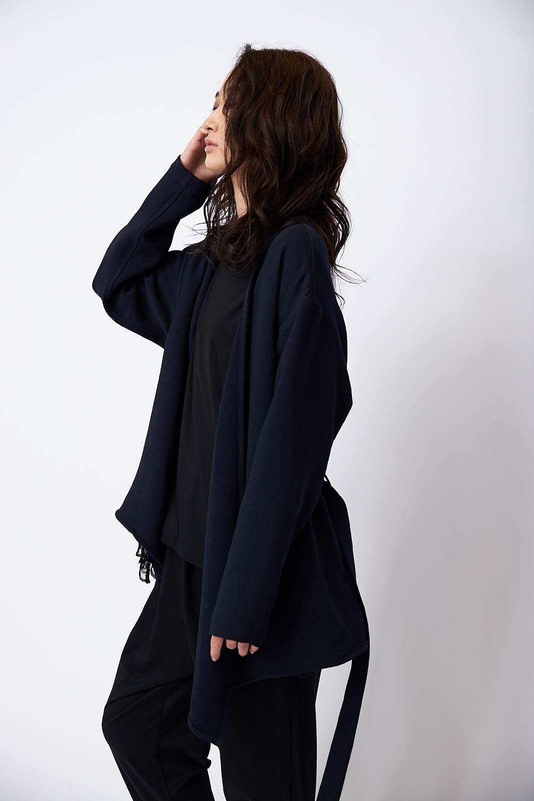 上下ブラウンのセットアップにポンチョジャケットを重ね着したジャケット・オン・ジャケットのスタイリング。