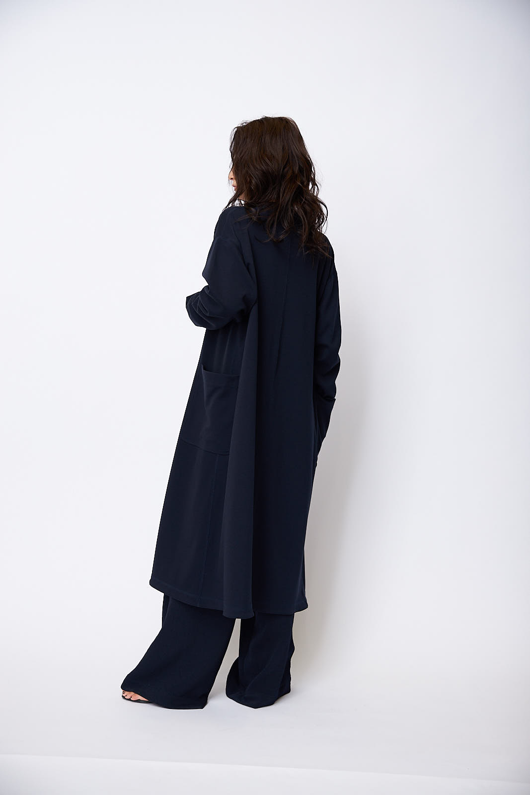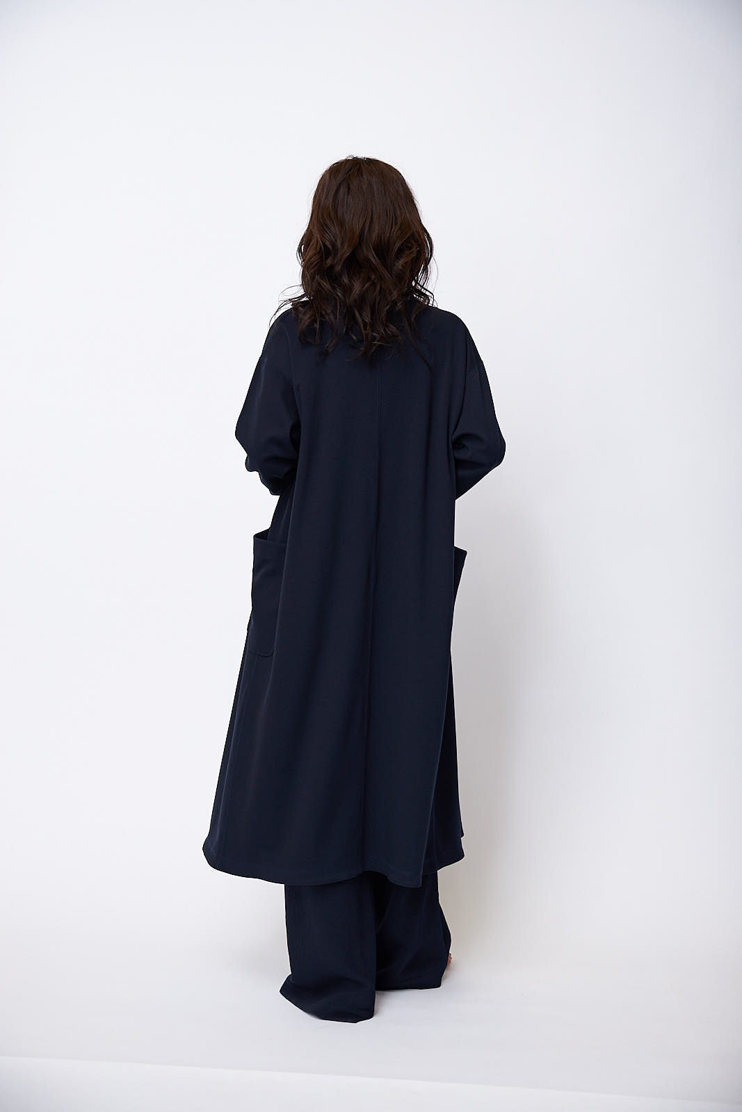 シャツワンピースの前を開けガウン風に羽織ったスタイリング。