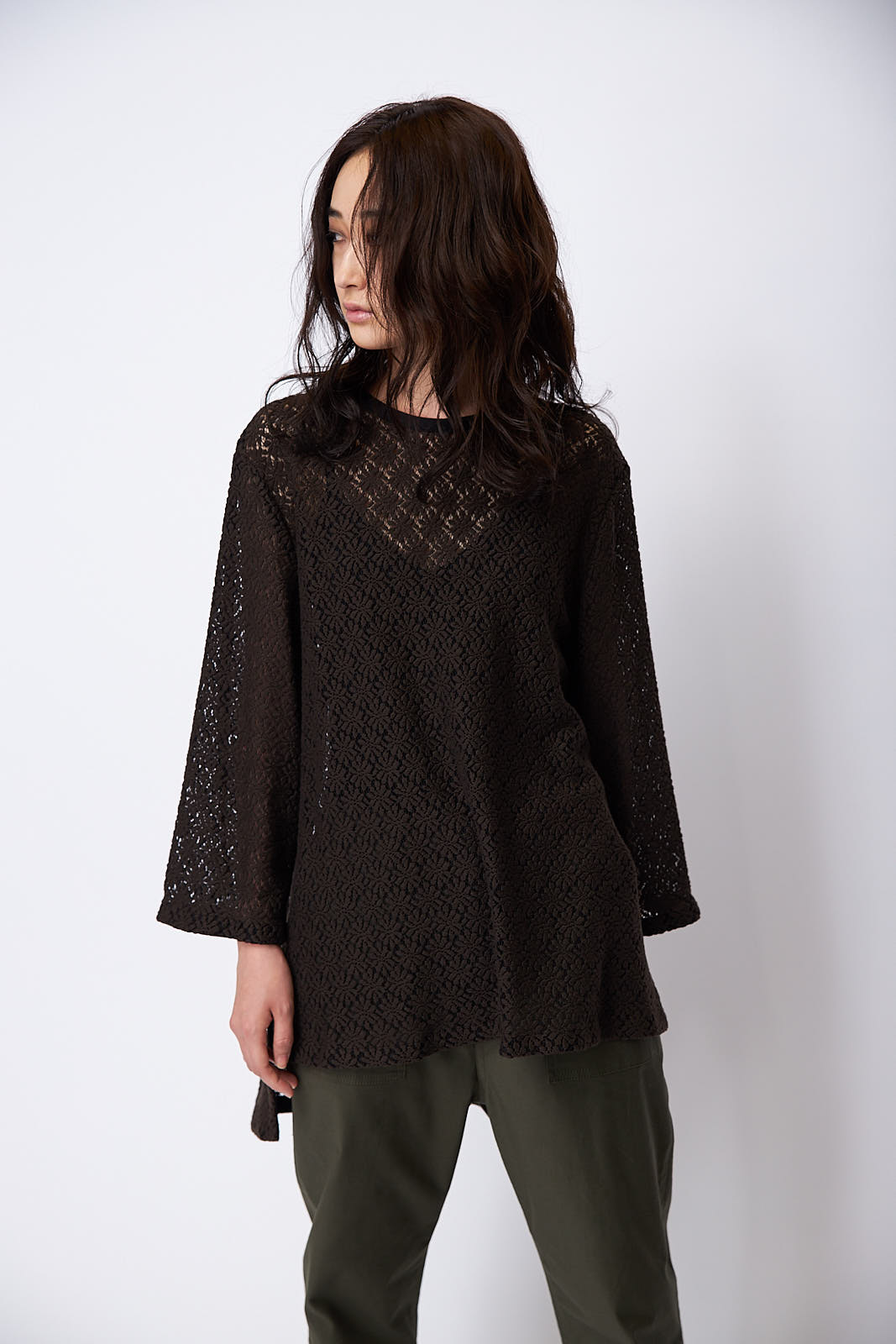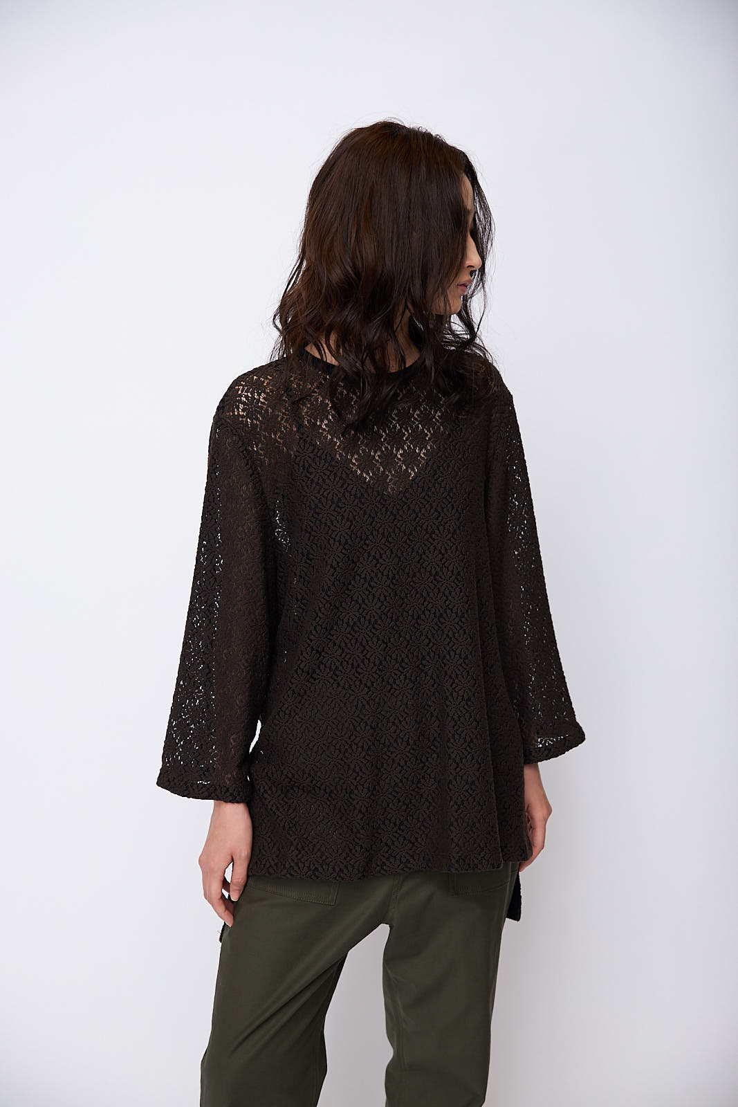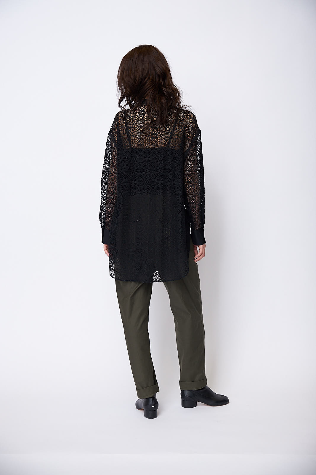 ボトムスにはゆったりとしたシルエットのワイドパンツを着用、インナーのレースがジャケットの裾からちらりと見える着こなしも、さり気なくおしゃれ。