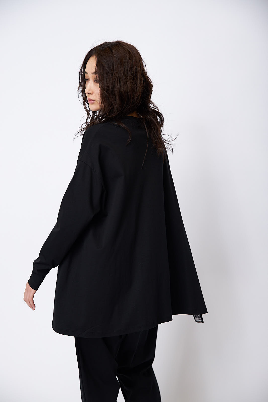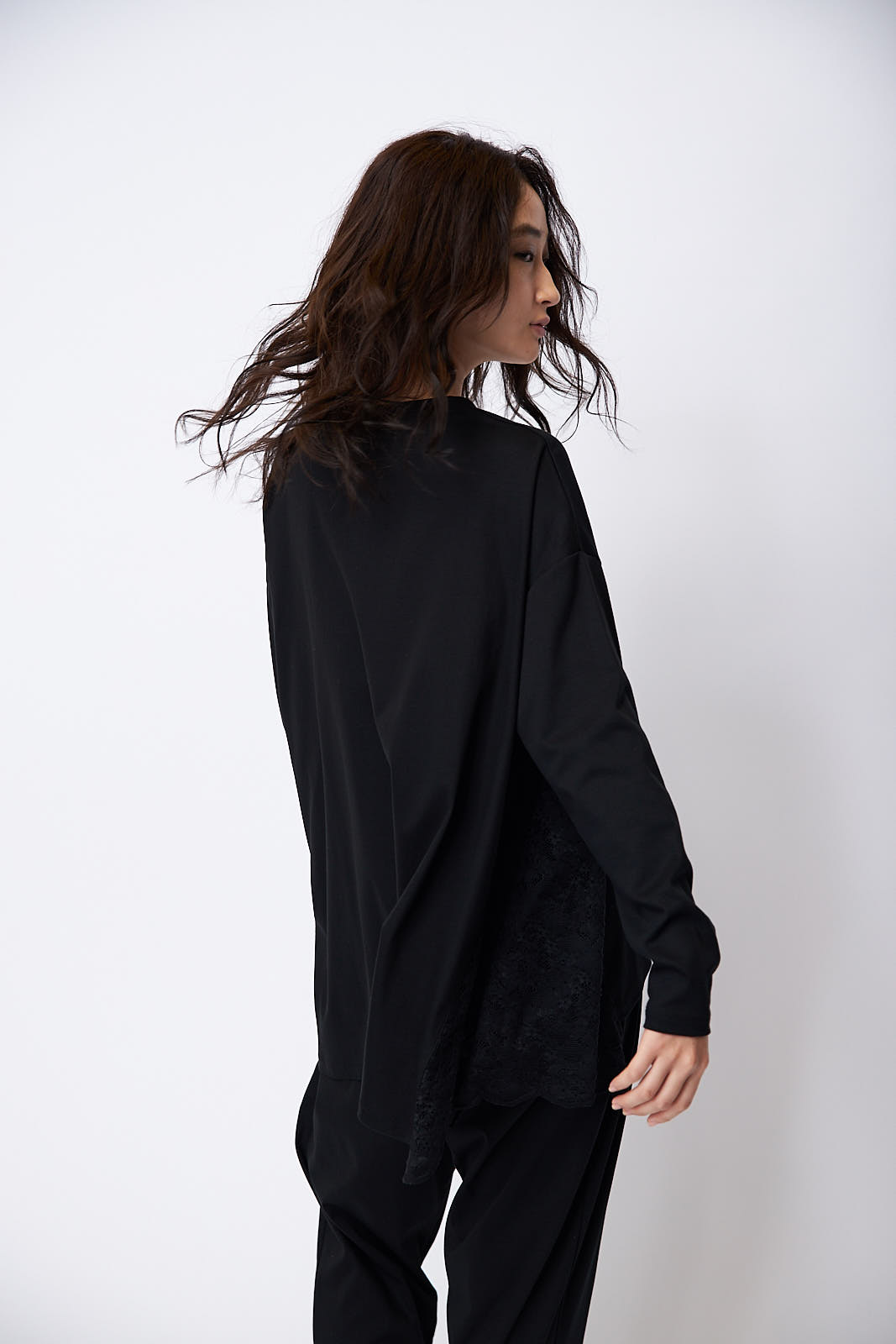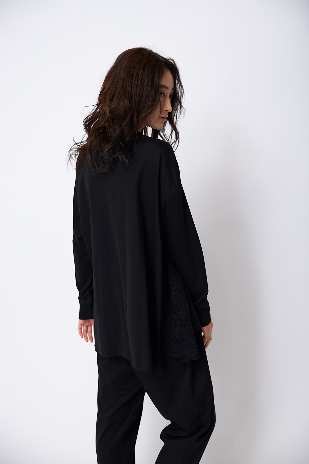トップスのレース切替がアクセント、ゆるりとしたとしたシルエットが、重たい雰囲気を感じさせないというのも、このコーディネートのポイント。