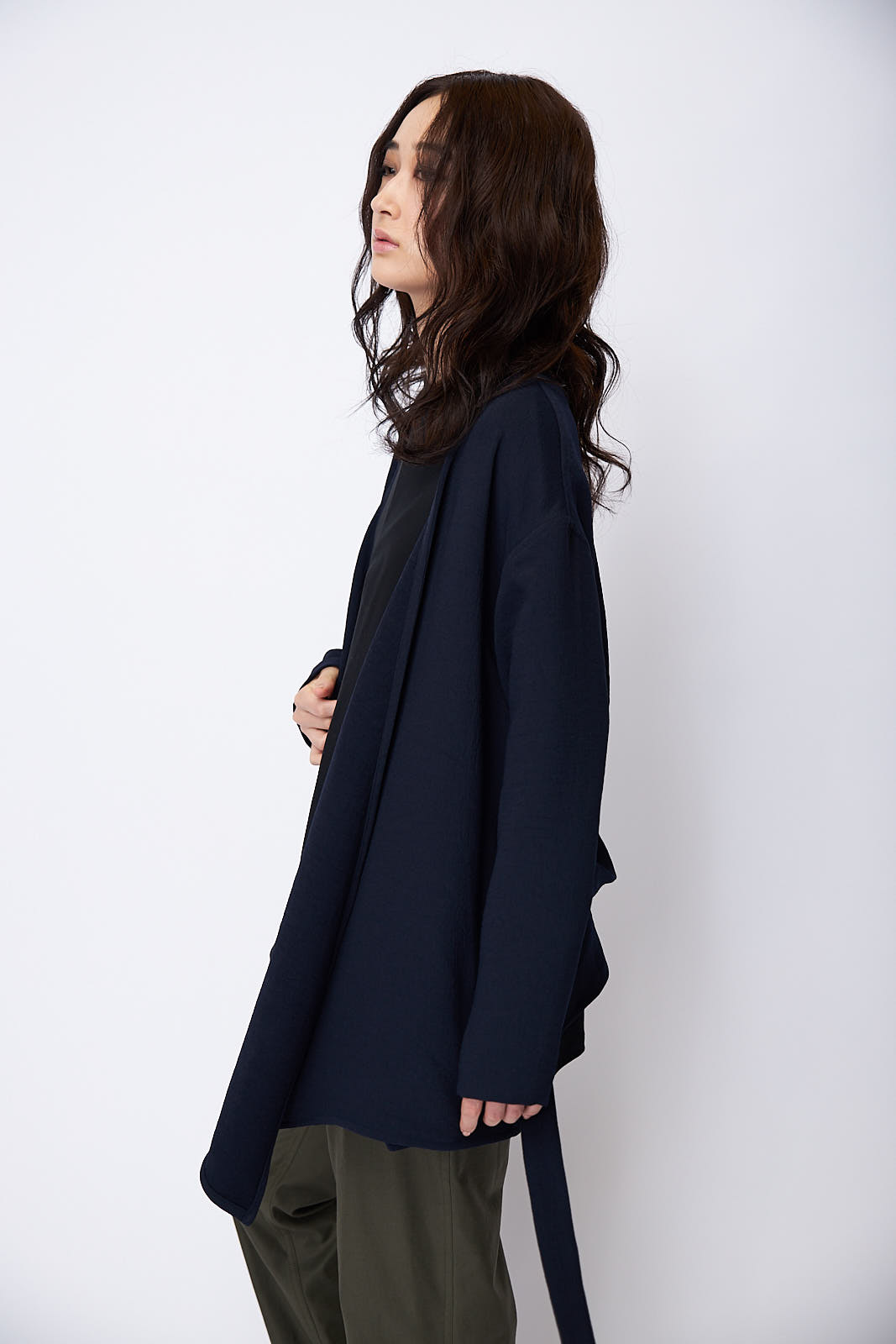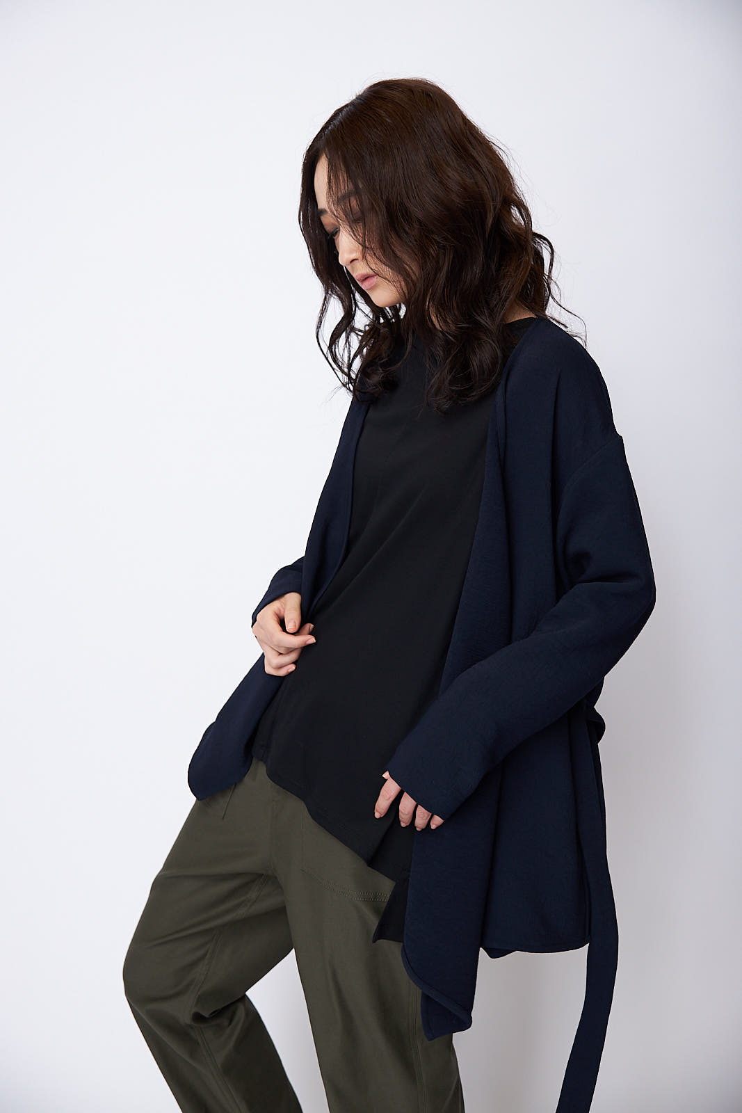 ボリューム感のあるポンチョジャケットと裾に向かって細身になるテイパードパンツを合わせたYラインシルエットのスタイリング。