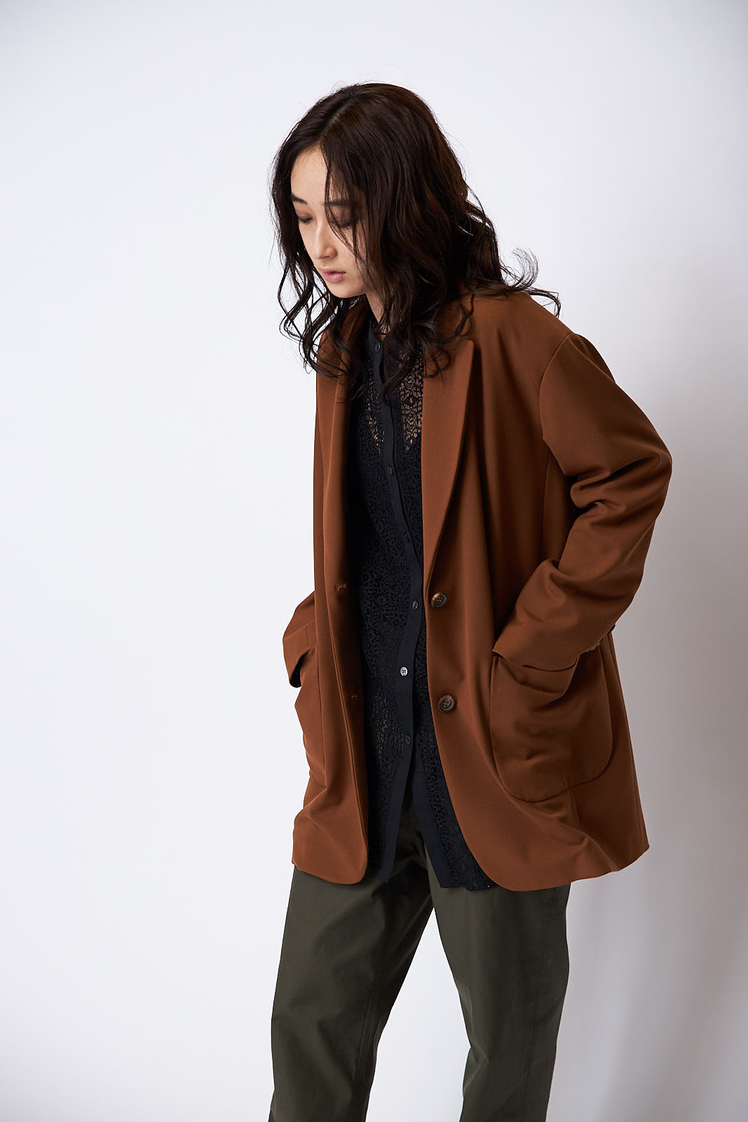 インナーに繊細な印象を与えるレースブラウスを着用、ブラウスの裾をパンツにタックインして着こなしているのも、このスタイリングのポイントです。